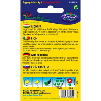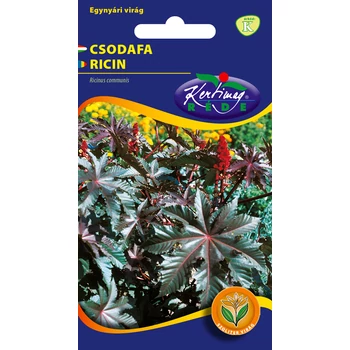 Nagy, ujjasan osztott levelű, 150-200 cm magas, egynyári növény. Elsősorban leveleivel díszít. A levél bordó, fürtös virágai jelentéktelenek, sárgák, termése tüskés tok, ami pirosra színeződik. Április végén vetjük állandó helyére, fészekbe. Mélyrétegű, tápanyagban gazdag talajban, rendszeresen öntözve hatalmas termetűre fejlődik. Nagyobb gyepfelületekre csoportosan vagy egyenként ültethetjük, falak, járdák, kerítések mellett cserjepótlónak, takarónövénynek is kiváló. Magja erősen mérgező! |
