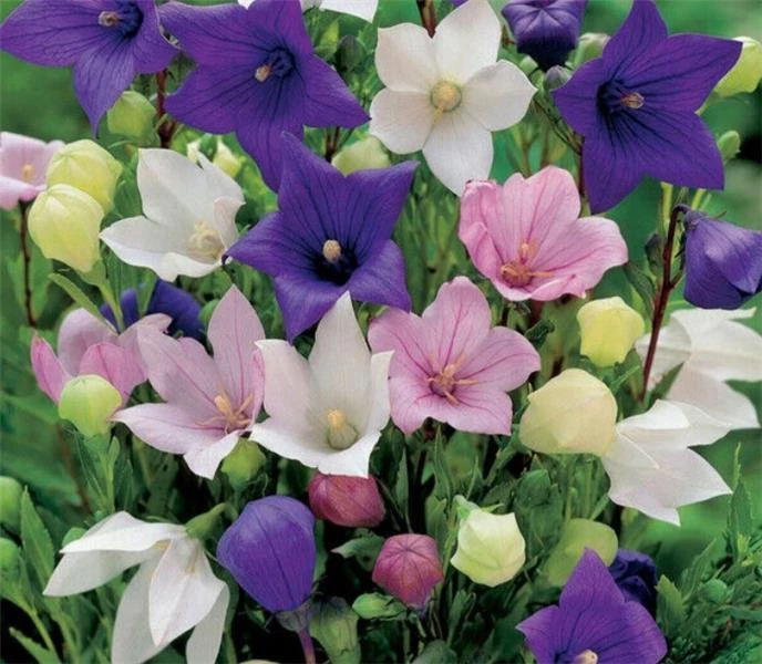 Platycodon grandiflorus ‘Mix’- Léggömbvirág ( színkeverék) Kb 25-35 cm magas, kompakt növekedésű bokor. Nagy harang alakú virágait júniustól augusztusig hozza, de vissza vágással másodvirágzásra is ösztönözhetjük. Napos, vagy félárnyékos helyen, laza, tápanyagdús talajban fejlődik a legjobban. Ültethetjük sziklakertbe, támfalba, virágágyásba, edénybe is. Fehér, lila, kék, rózsaszín színek lehetnek a mixbe.